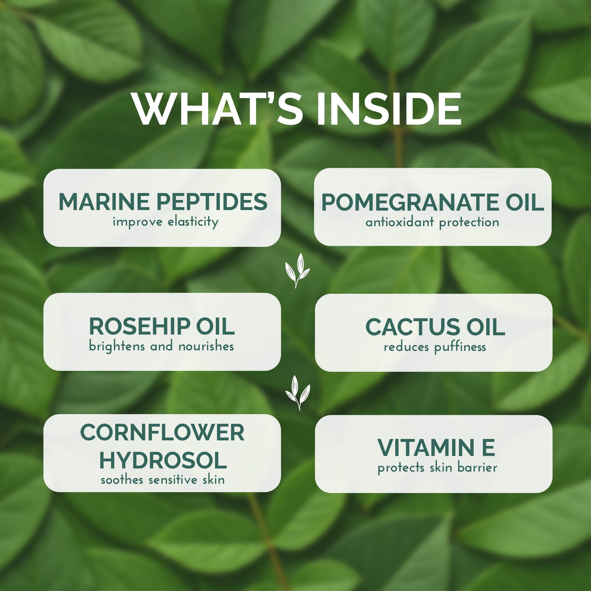 Experience the luxurious care your delicate skin deserves with Honest & Pure Eye & Neck Cream, a premium formula designed to rejuvenate and protect the eye areas and neck. Enriched with marine peptides, rosehip oil, cactus oil, and pomegranate oil, this multi-tasking cream works to treat dark circles, reduce fine lines and wrinkles, and visibly improve puffy under eye concerns.
