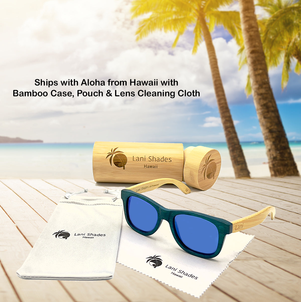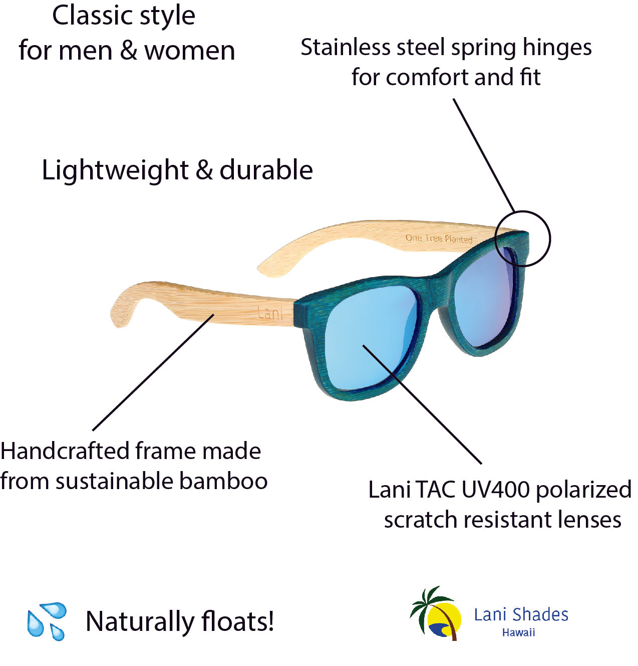 All Lani Shades bamboo and wood sunglasses feature UV400 Polarized Lani TAC scratch resistant lenses - highest quality lenses in expertly handcrafted eco friendly bamboo wood frames that are comfortable, lightweight and durable. All Lani Shades sunglasses are equipped with stainless steel spring hinges for comfort and fit. Each also comes with a sturdy bamboo tube case, microfiber cleaning cloth, pouch and worry free guarantee.