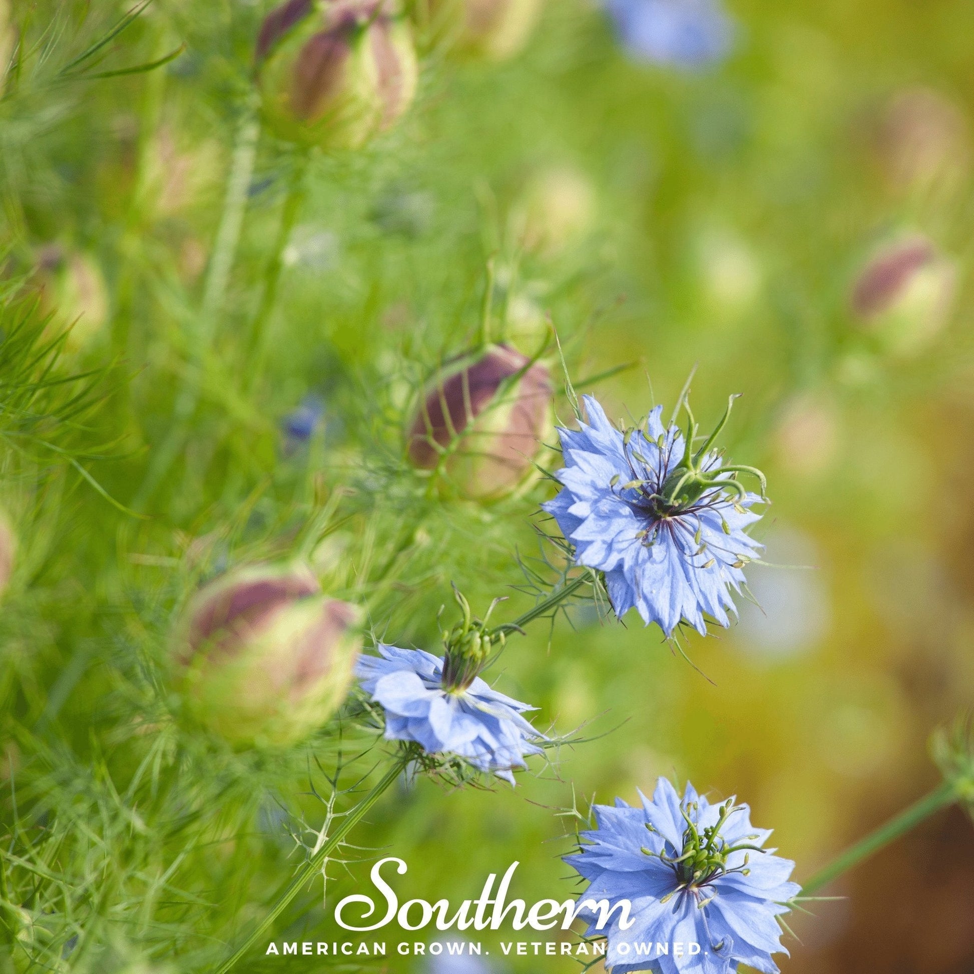 Grow one of the world's most treasured ancient spices with our Black Cumin seeds. Also known as Charnushska or Nigella, this beautiful heirloom is as lovely as it is useful. The plant boasts fine, feathery foliage and delicate, sky-blue flowers that give way to fascinating, puffy seed pods. Inside are the prized jet-black seeds, which have a unique, pungent flavor with notes of oregano and pepper, essential for authentic Middle Eastern and Indian breads, pickles, and savory dishes.