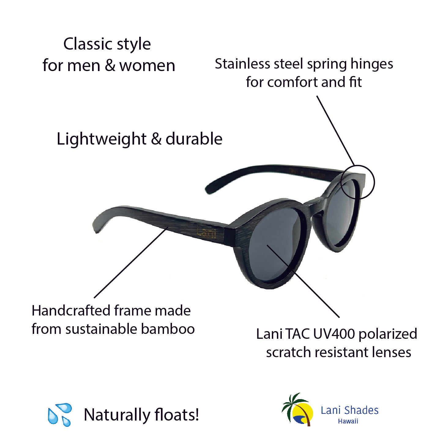 All Lani Shades bamboo and wood sunglasses feature UV400 Polarized Lani TAC scratch resistant lenses - highest quality lenses in expertly handcrafted bamboo wood frames that are comfortable, lightweight and durable. All Lani Shades sunglasses are equipped with stainless steel spring hinges for comfort and fit. Each also comes with a sturdy bamboo tube case, microfiber cleaning cloth, pouch and worry free guarantee.