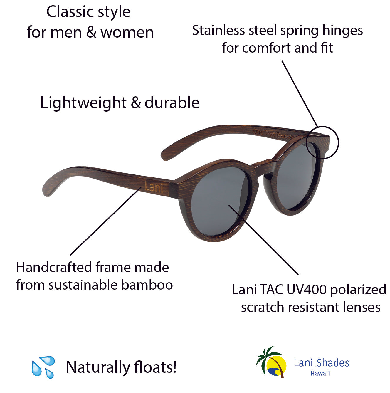 Protect your eyes in style with the Moana Mauka polarized bamboo wood sunglasses by Lani Shades. The Lani Shades Moana Mauka is a round lens style frame for men and women inspired by the good vibes of Ala Moana on Oahu's south shore. The Moana Mauka is made of sustainable bamboo that is durably dyed the color of the leeward land (Mauka) of Hawaii.