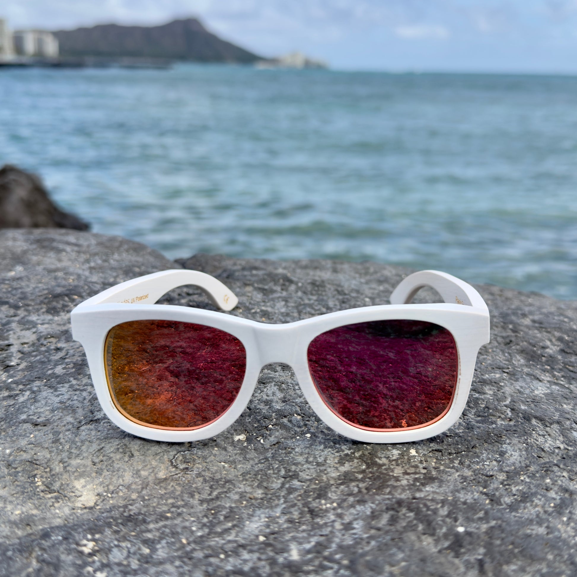 Protect your eyes in style with the Ohe Ao polarized sustainable bamboo wood floating sunglasses by Lani Shades. The Lani Shades Ohe Ao is an all bamboo Eddie Style for men and women featuring all sustainable bamboo (Ohe) frames that are durably dyed Ao, the color of the trade wind cumulus clouds that glide over the Hawaiian islands.