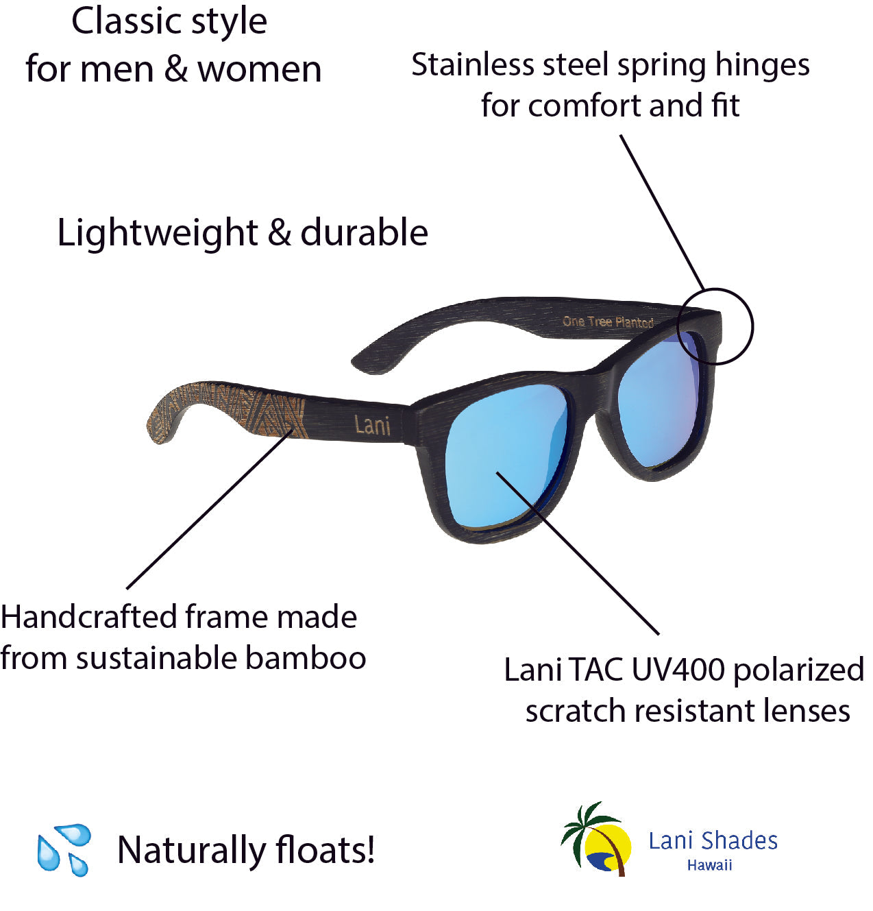 Designed by sailors in Hawaii in the search for the perfect sunglasses to have on the water. Lani Shades bamboo and wood sunglasses frames float and if they float away, that's less plastic on the beach. Each pair sold plants a tree through our partnership with One Tree Planted.