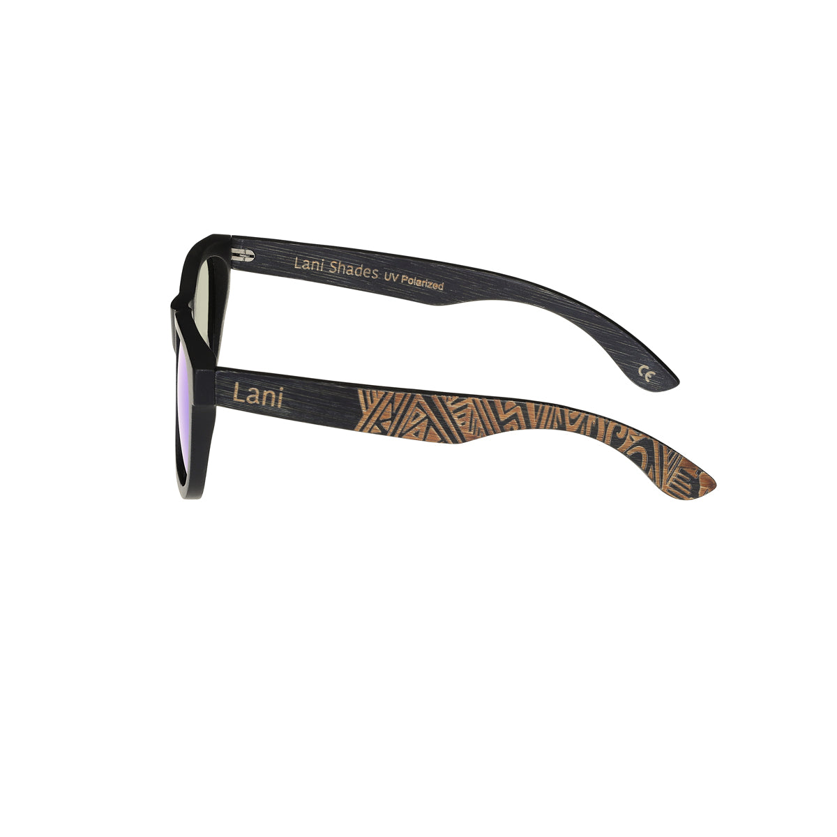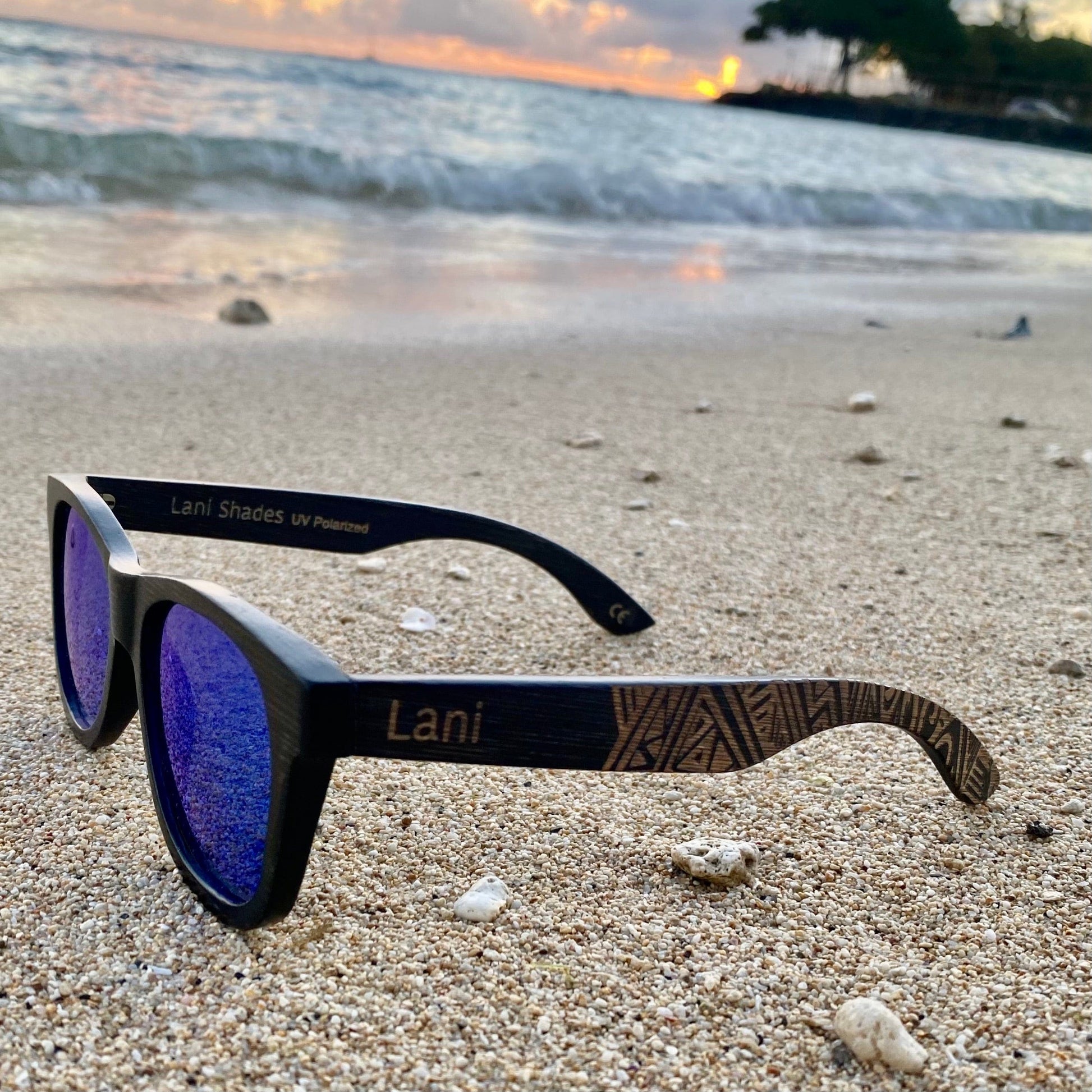 Protect your eyes in style with the Ohe Mana Kai polarized sustainable bamboo wood floating sunglasses by Lani Shades. The Lani Shades Ohe Mana Kai style etched bamboo wood sunglasses is an all bamboo Eddie Style for men and women featuring all bamboo (Ohe) frames that are durably dyed the color of the great 'Iwa bird that flies over Hawaii. The Ohe Mana Kai is etched with the spirit (Mana) of the sustainable bamboo that make Lani Shades. The Ohe Mana Kai is similar to the Ohe Mana, except the etching is reverse pattern, the Ohe Mana Kai is etched after the dye.