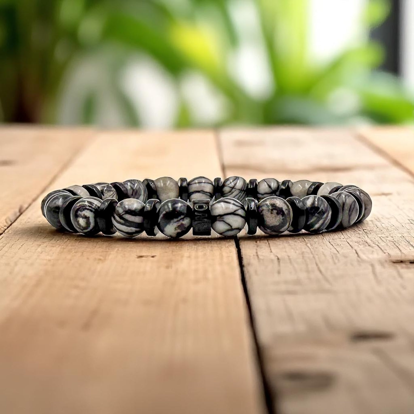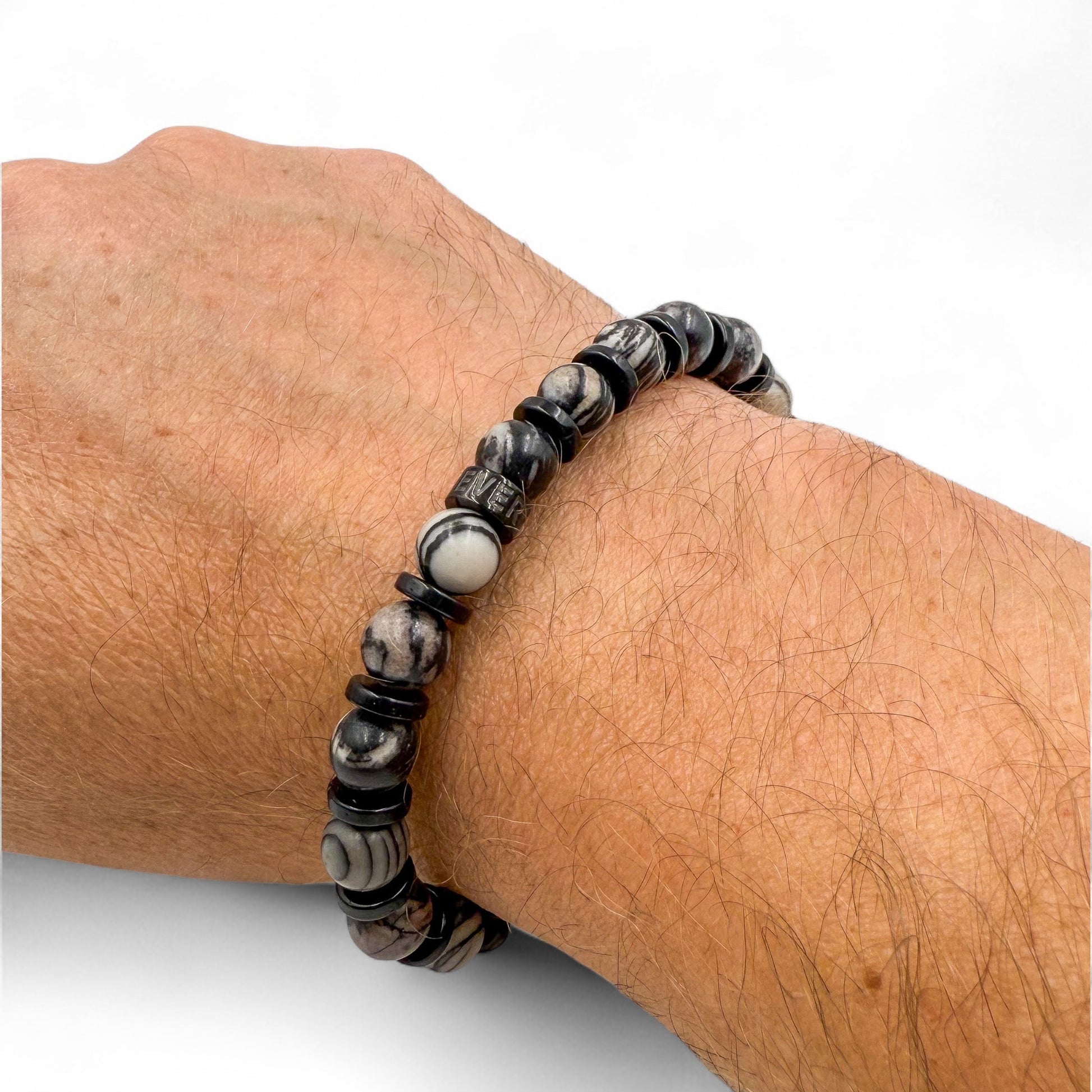 Dark, smooth, and effortlessly sharp—the Gravel Web bracelet is built for those who move with quiet confidence. Featuring the smoky patterns of black silk stone paired with deep-toned blackwood beads, this men’s bracelet brings a balanced mix of grit and polish. A black stainless steel spacer bead engraved with the Everwood name adds that final edge. Whether you’re dressed down or dialed in, Gravel Web delivers everyday style with a subtle bite.