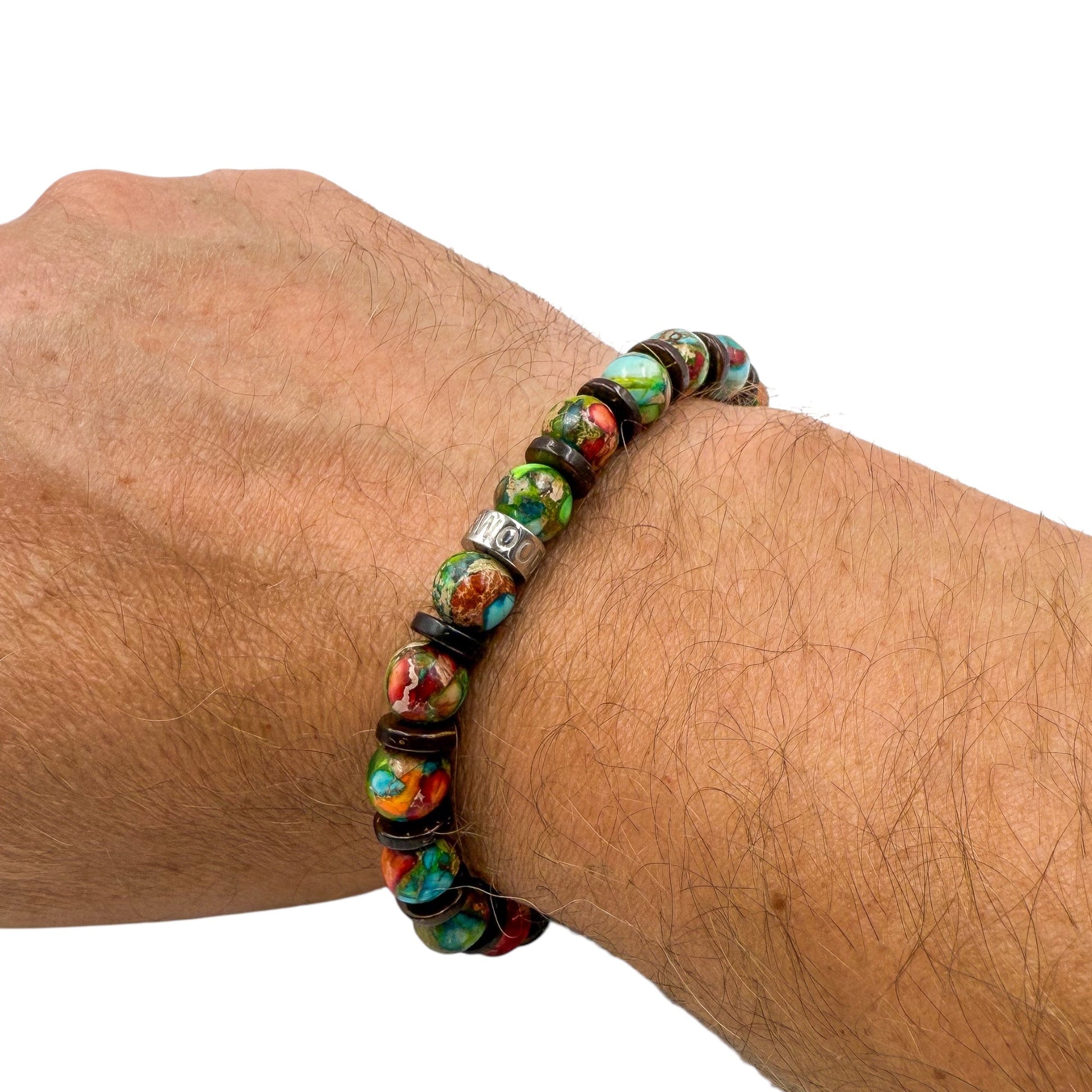 Turn heads without saying a word. The Jungle Fiesta bracelet is all about bold color and natural style. With vibrant rainbow jasper beads bringing the energy and warm brown coconut wood adding that earthy balance, this piece is like a tropical escape for your wrist. The polished silver stainless steel spacer—engraved with the EVERWOOD name—adds a clean, premium finish. Perfect for summer vibes, weekend getaways, or just breaking up the black-and-grey wardrobe, Jungle Fiesta brings personality and punch to your everyday carry.