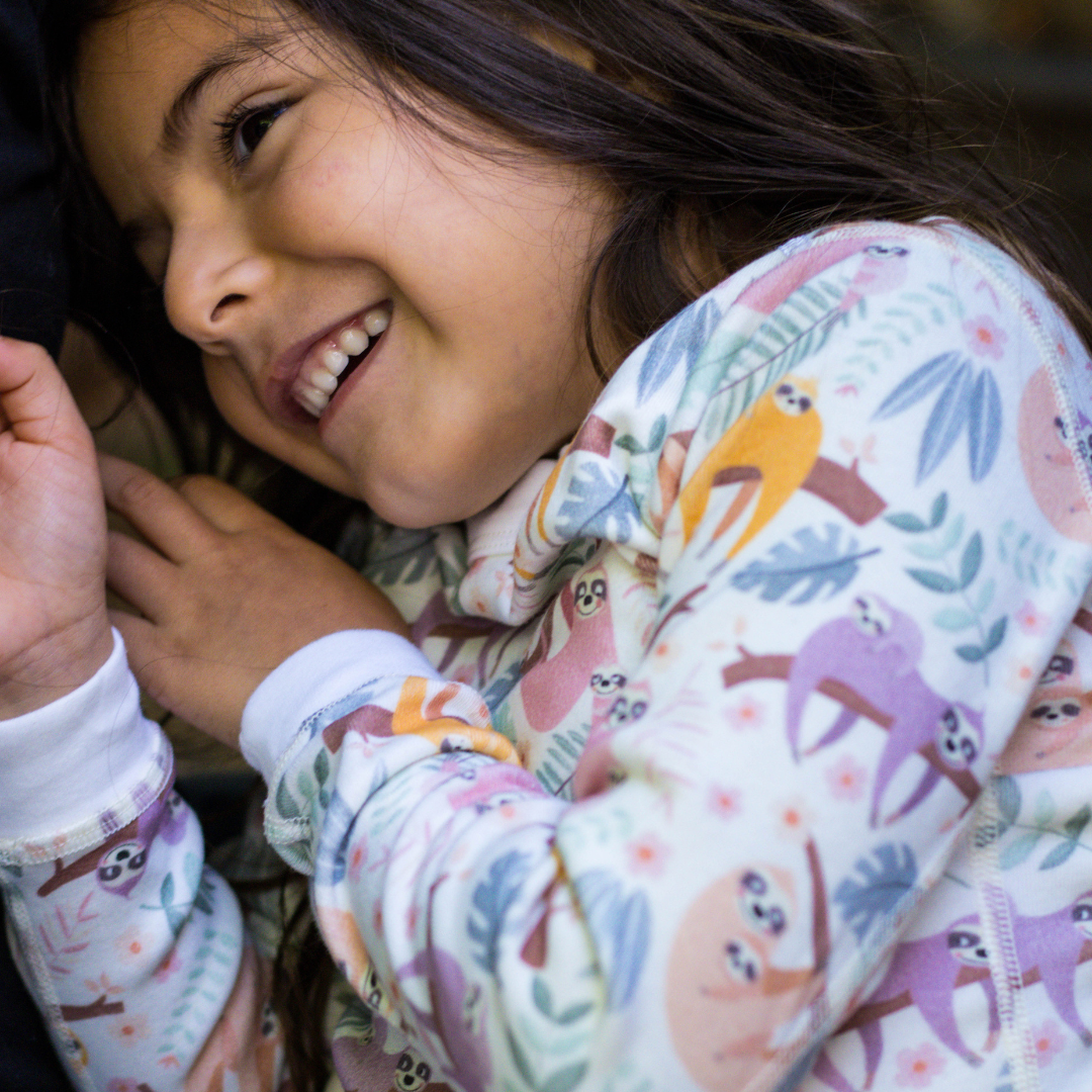 Mukupati's Organic Cotton Pajamas, featuring playful and unique prints of sloths frolicking in the branches!