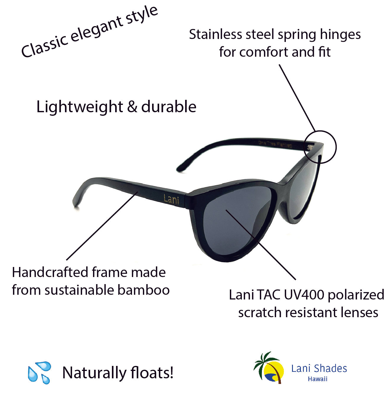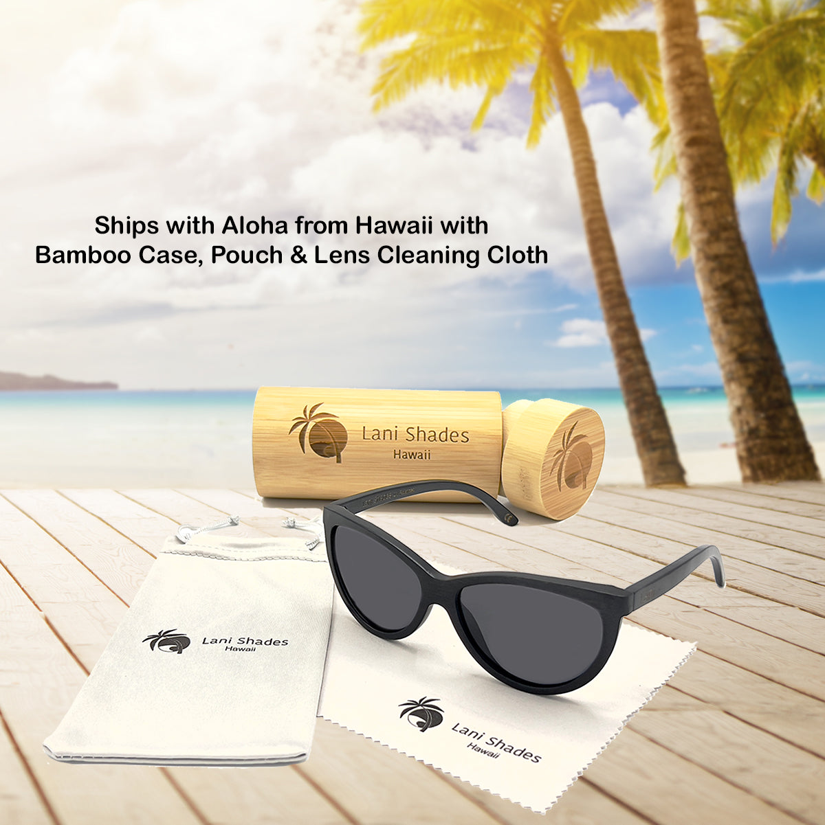 All Lani Shades bamboo and wood sunglasses feature UV400 Polarized Lani TAC scratch resistant lenses - highest quality lenses in expertly handcrafted bamboo wood frames that are comfortable, lightweight and durable. All Lani Shades sunglasses are equipped with stainless steel spring hinges for comfort and fit. Each also comes with a sturdy bamboo tube case, microfiber cleaning cloth, pouch and worry free guarantee.
