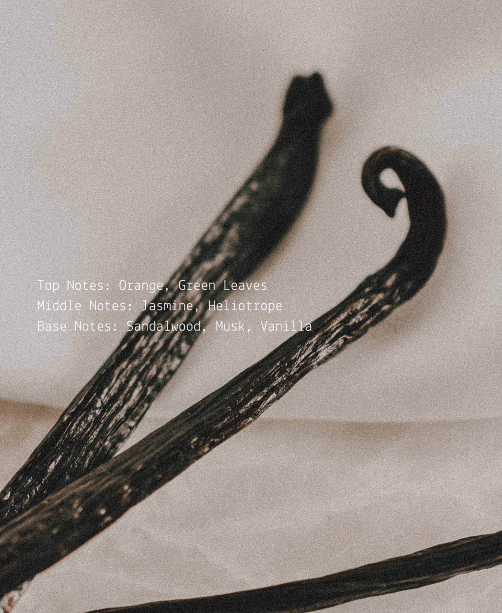 It opens with a wash of citrus: sun-warmed orange and verdant green leaves cut through the static, clearing space. Jasmine and heliotrope unfold at the center—delicate, intimate, like skin kissed by late light. A base of sandalwood, sheer musk, and trace vanilla lingers—soft, slow, almost imperceptible. But it’s there. And it stays.